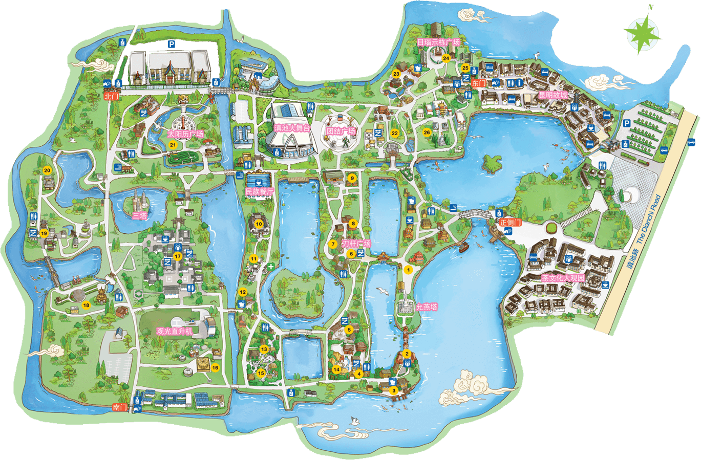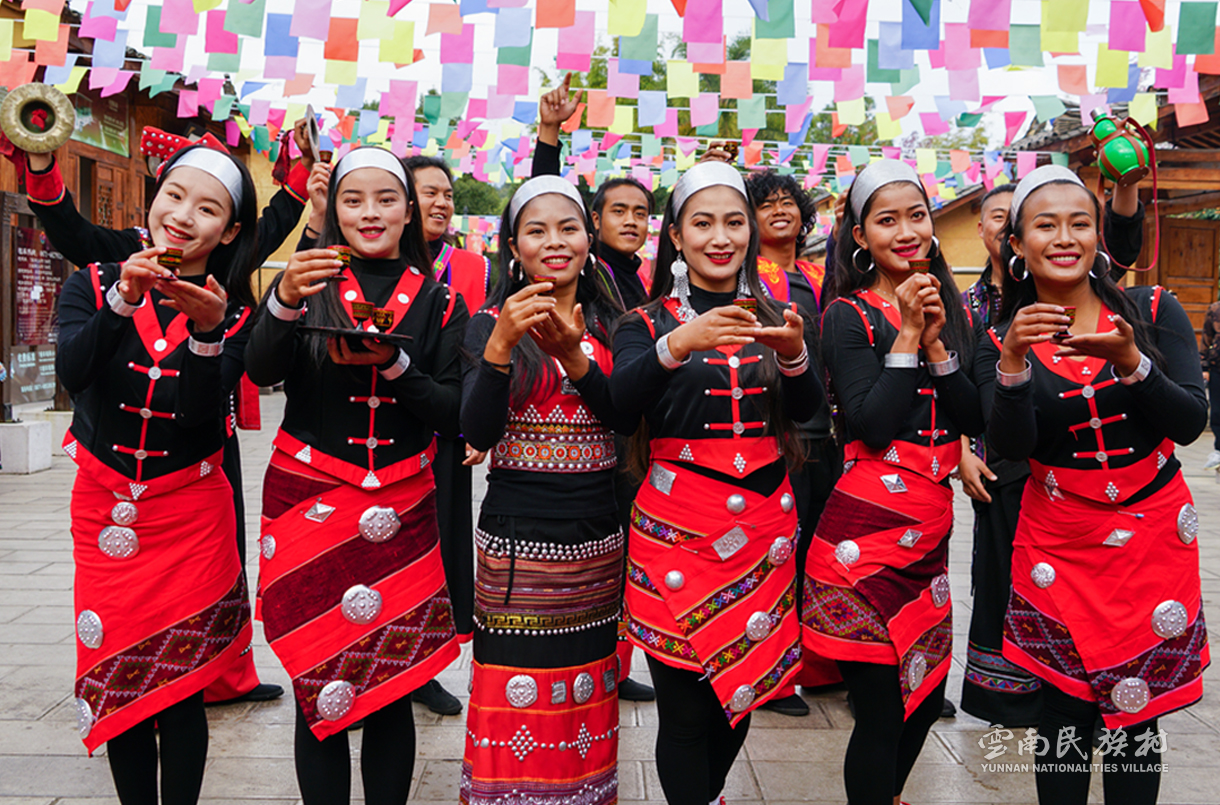彝族在云南境內(nèi)約471萬人,是省內(nèi)人口最多、分布最廣的少數(shù)民族,主要聚居在金沙江、元江流域和哀牢山、無量山腹地。彝族是一個(gè)能歌善舞的民族,民間打歌、跳樂之風(fēng)盛行,大三弦、跌腳舞久負(fù)盛名。火把節(jié)是彝族最具特色的民族節(jié)日。彝族村占地50余畝,三虎浮雕墻與虎頭內(nèi)祖師形象表現(xiàn)了彝族虎鷹文化。太陽歷廣場圖騰柱上有太陽、虎、火和八卦圖形象,周圍環(huán)繞著10個(gè)朝向不同的月球造型,外圓周有12生肖石雕。依山而建的“...